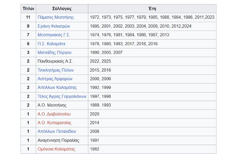 ** Στην παρακάτω κάρτα βλέπουμε τις κατακτήσεις του κυπέλλου στον Νομό Μεσσηνίας με τον Πάμισο Μεσσήνης και την Εράνη Φιλιατρών να έχουν τις περισσότερες κατακτήσεις σε αυτό.