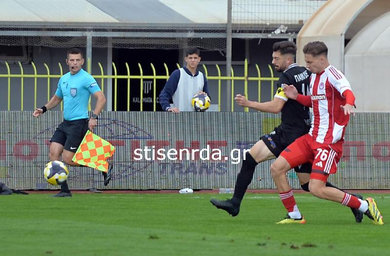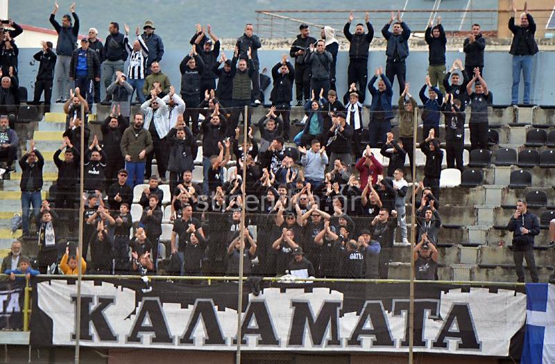 Η ομάδα της Καλαμάτας ξεκίνησε δυνατά το παιχνίδι, θέλοντας από νωρίς να πετύχει ένα γκολ που θα ξεκλείδωνε την άμυνα των φιλοξενούμενων και στο πρώτο τέταρτο του αγώνα είχε πέντε επικίνδυνες επισκέψεις στα καρέ του Έξαρχου με τους Μιράντα στο2′ και στο 8′ τον Παμλίδη στο 4′ και στο 14′ και τον Βαφέα στο 15′ να μη μπορούν να βρουν το στόχο. Μέχρι που ήρθε το 25′ όταν η ομάδα της Καλαμάτας θα κερδίσει πέναλτι σε ανατροπή του Μάντζη από τον Αργυρίου και τον διαιτητή κύριο Αλιάγα να δείχνει την άσπρη βούλα, ο Παμλίδης ανέλαβε την εκτέλεση της εσχάτης των ποινών και έστειλε τη μπάλα στην αριστερή γωνία του Έξαρχου που έπεσε σωστά αλλά η μπάλα κατέληξε στα δίχτυα του για το 1-0.Στη συνέχεια ο ρυθμός του παιχνιδιού έπεσε με μόλις δύο φάσεις ακόμα στο 30′ σουτ από τον Οικονόμου μπλόκαρε ο Γκέλιος και σουτ του Κεϊτά στο 41‘ από πλάγια αριστερά να περνά έξω από το δεξί δοκάρι του Γκέλιου.