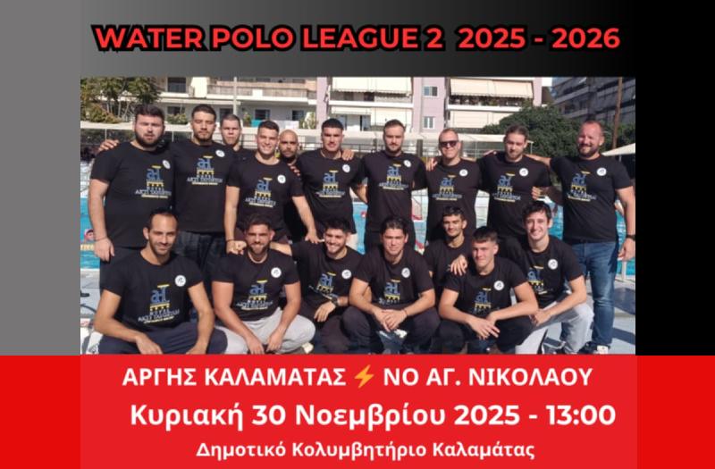 Το ταξίδι συνεχίζεται για τον Άργη Καλαμάτας… Το ερχόμενο Σαββατοκύριακο 29 – 30/11/2025 θα πραγματοποιηθεί η 3η αγωνιστική του πρωταθλήματος υδατοσφαίρισης της Α2’ Εθνικής Κατηγορίας Ανδρών (Water Polo League 2) για την αγωνιστική χρονιά 2025-2026. Η καλαματιανή ομάδα θα αντιμετωπίσει εντός έδρας την ομάδα του Ν.Ο. Αγ. Νικολάου την Κυριακή 30 Νοεμβρίου 2025 στις 13:00. Το παιχνίδι θα διεξαχθεί στο Δημοτικό κολυμβητήριο της Καλαμάτας.