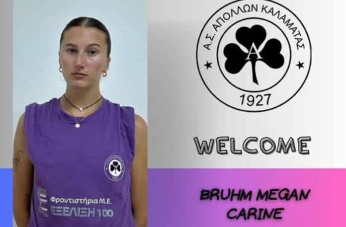 « Η οικογένεια του Απόλλωνα Καλαμάτας μεγαλώνει, καθώς υποδέχεται τη Megan Carine Bruhm από τον Καναδά!. Η Megan είναι διαγώνιος με εξαιρετικά φυσικά προσόντα, δυνατή επίθεση και μεγάλη ενέργεια στο γήπεδο, στοιχεία που αναμένεται να δώσουν σημαντικές λύσεις στην επιθετική μας γραμμή. Πέρα όμως από την αθλητική της αξία, η Megan ξεχωρίζει και για το ήθος, την εργατικότητα και τον χαρακτήρα της — μια αθλήτρια με θετική παρουσία, που ενσωματώνεται άμεσα στο ομαδικό πνεύμα και στις αξίες του Απόλλωνα. Είμαστε χαρούμενοι που τη καλωσορίζουμε στην Καλαμάτα και ανυπομονούμε να τη δούμε να προσφέρει τη δύναμή της μέσα στο γήπεδο!.