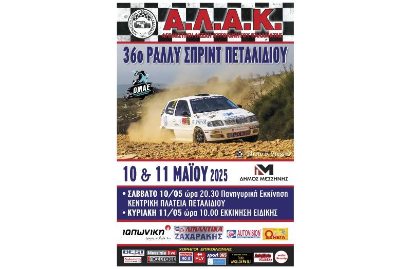 Η αντίστροφη μέτρηση για το 36ο Ράλλυ Σπριντ Πεταλιδίου έχει ξεκινήσει. Το ραντεβού των φίλων του μηχανοκίνητου αθλητισμού με το θέαμα έχει οριστεί στις 10 και 11 Μαΐου στη χωμάτινη ειδική διαδρομή στο Πεταλίδι, μήκους περίπου 12,6 χιλιομέτρων, όπου είχε γίνει με επιτυχία και η περσινή διοργάνωση.
