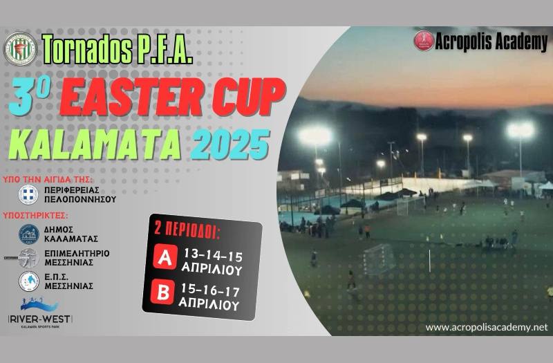 Την Κυριακή 13 Απριλίου 2025 ξεκινάει το 3ο EASTER CUP – KALAMATA 2025. Μια διοργανώσει που έχει γίνει θεσμός για το ποδόσφαιρο στις αναπτυξιακές ηλικίες στην πόλη μας. Σύμφωνα με τους διοργανωτές 40 ακαδημίες θα συμμετέχουν φέτος με πάνω από 140 αγωνιστικά τμήματα.