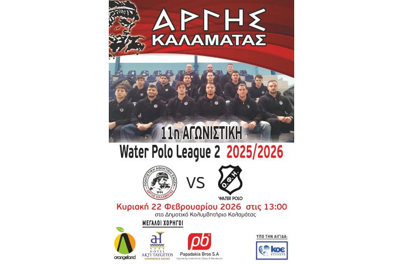Το ταξίδι συνεχίζεται για τον Άργη Καλαμάτας. Στο σημαντικότερο αγώνα της χρονιάς, η καλαματιανή ομάδα θα αντιμετωπίσει τον Ο.Φ.Η. την Κυριακή 22 Φεβρουαρίου 2026 στις 13:00 στο Δημοτικό κολυμβητήριο της Καλαμάτας. Στην προσπάθεια της ομάδας, αναμένουμε τη στήριξη του καλαματιανού κοινού.