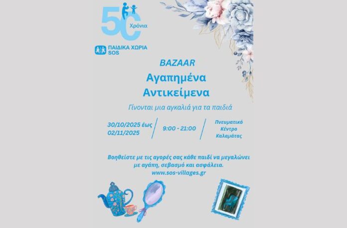 Μια αγκαλιά για τα παιδιά ανοίγουν και πάλι τα Παιδικά Χωριά SOS στη Καλαμάτα οργανώνοντας ένα παζάρι με χρηστικά και διακοσμητικά αντικείμενα από αύριο 30 Οκτωβρίου έως την Κυριακή 2 Νοεμβρίου 2025 (ώρες: 9:00 – 21:00) στο Πνευματικό Κέντρο Καλαμάτας.