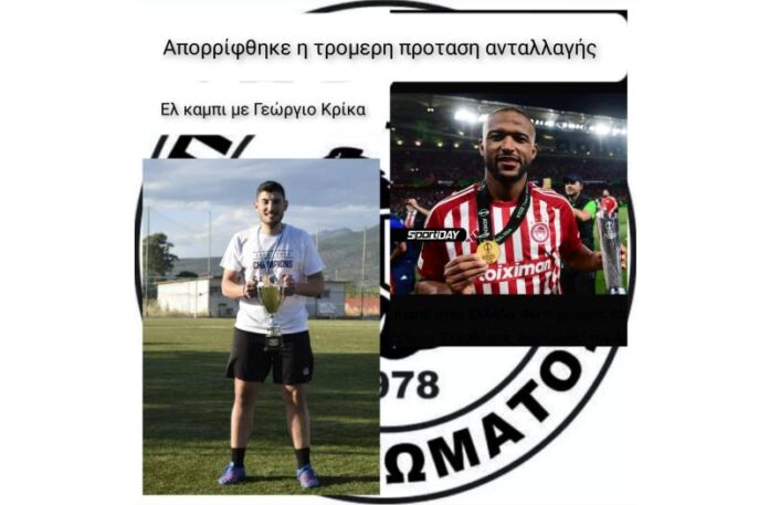 Έσκασε μόλις τώρα. Μετά τη φοβερή εμφάνιση του Γιώργου Κρίκα η οποία συνοδεύτηκε με δύο γκολ στο παιχνίδι του ΠΑΟΚ με την Θύελλα Μερόπης, έσκασε πρόταση στα γραφεία της ομάδας στο Καλάμι πριν από λίγα λεπτά, για ανταλλαγή Γιώργου Κρίκα με Ελ Κααμπί. Όπως ήταν αναμενόμενο η πρόταση απορρίφθηκε ασυζητητί. Για ότι νεότερο θα σας ενημερώσουμε !!!.