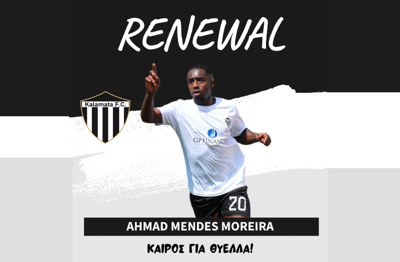 « Η ΠΑΕ Καλαμάτα είναι στην ευχάριστη θέση να ανακοινώσει την ανανέωση της συνεργασίας της με τον ποδοσφαιριστή Αχμάντ Μέντες Μορέιρα (Ahmad Mendes Moreira) για τον επόμενο χρόνο, με δυνατότητα επέκτασης για ακόμη έναν. Ο 30χρονος Ολλανδός μεσοεπιθετικός, με καταγωγή από την Γουινέα, αγωνίζεται στη Μαύρη Θύελλα από την περασμένη σεζόν, όπου κατέγραψε 27 συμμετοχές και πέτυχε 5 γκολ με τα μελανόλευκα.
