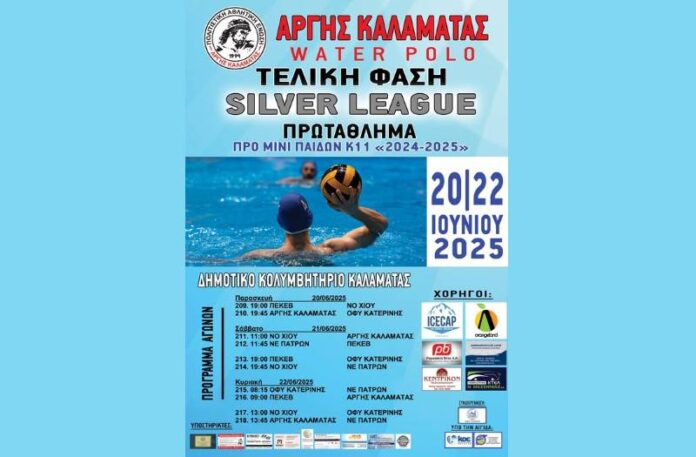 Στο δημοτικό κολυμβητήριο Καλαμάτας θα διεξαχθεί η τελική φάση του πρωταθλήματος προμινι (για παιδιά μικρότερα από 11 ετών) στην κατηγορία silver league 2024-2025, με τη συμμετοχή των μικρών υδατοσφαιριστών του Άργη Καλαμάτας. Οι αγώνες για το final 5 θα γίνουν το 3ημερο 20-22/06 σε ένα Όμιλο με 5 αγωνιστικές.