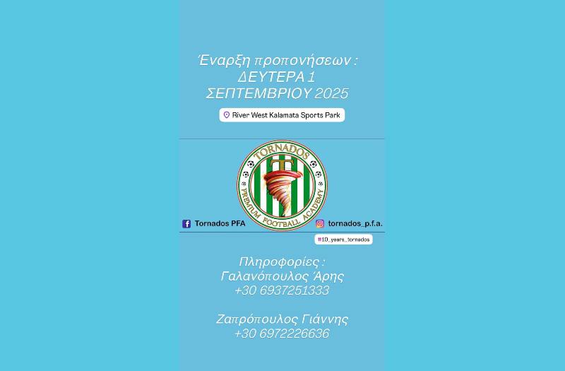 Η ακαδημία ποδοσφαίρου TORNADOS P.F.A. επιστρέφει στους αγωνιστικούς χώρους για δέκατη σεζόν και προετοιμάζεται για μια χρονιά με αρκετούς αγώνες, νέες εμπειρίες και παραστάσεις καθώς και πολλές εκπλήξεις.